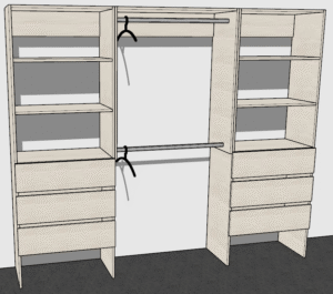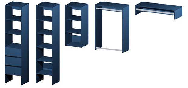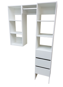 Tower 3 drawer cabinet, a Tower open shelf cabinet, Wall open shelf cabinet, Shelf with 1 rail for long items like dresses and Shelf with 2 rails for shorter items like shirts and trousers.